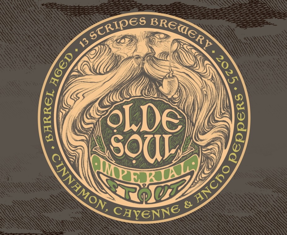 2025 11.8% OldeSoul Bourbon Barrel Aged Imperial Stout; spiced with cinnamon, cayenne, and ancho chilies.